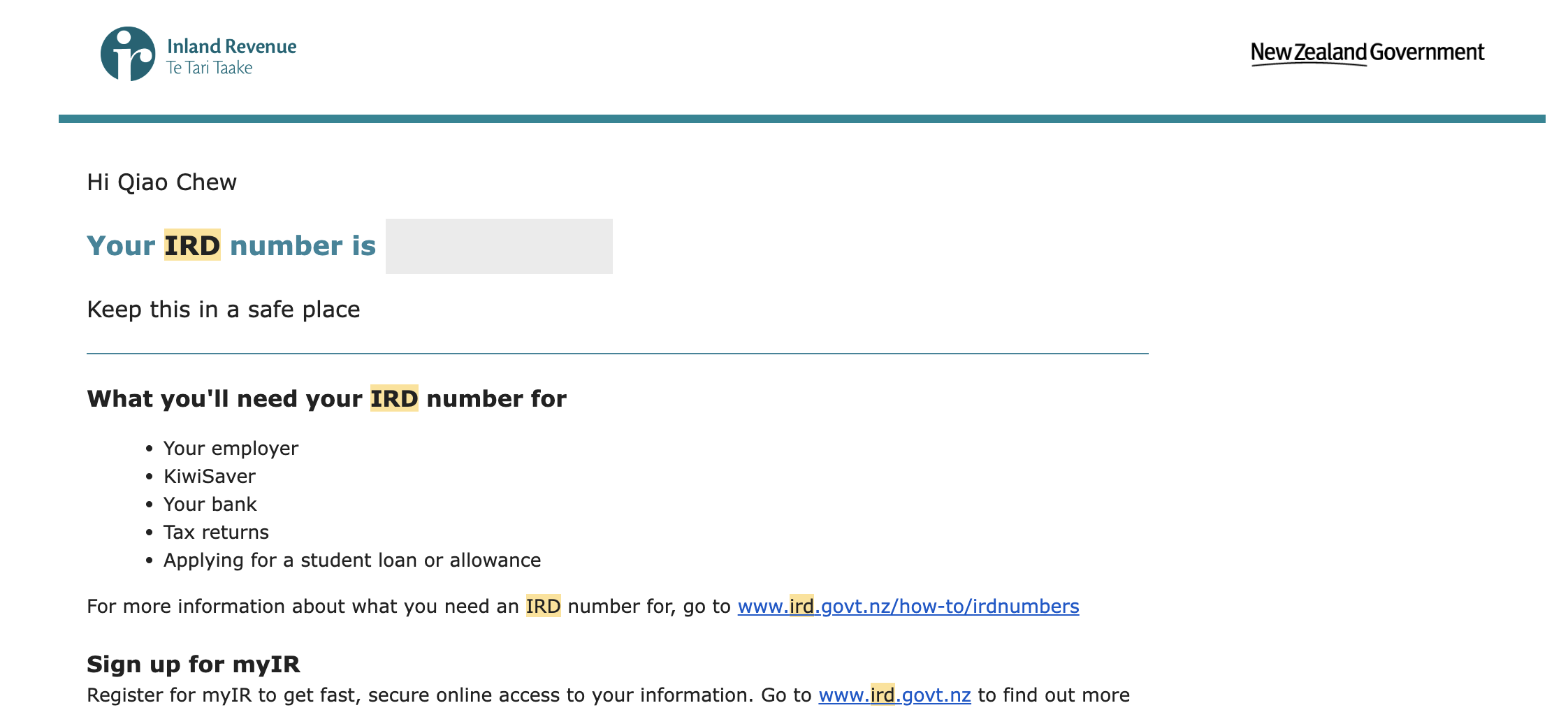 After obtaining the IRD number, remember to register and activate your account at https://www.ird.govt.nz/.
