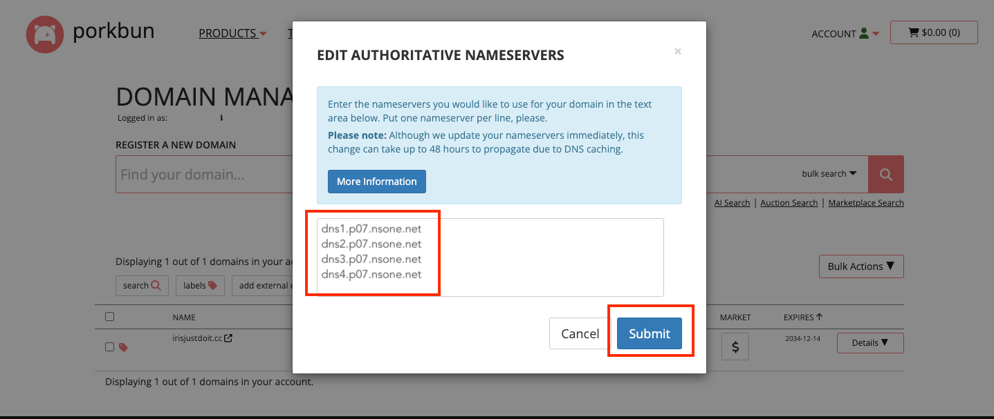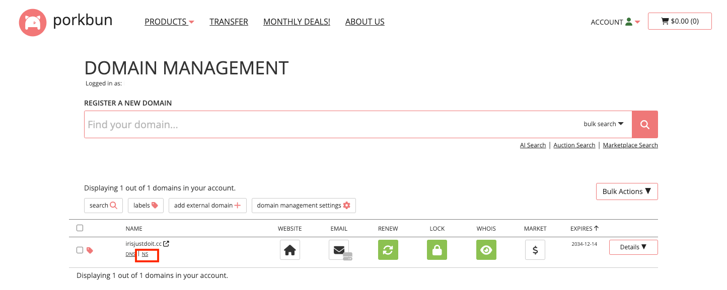 - Log in to Porkbun and click on "NS" displayed below the purchased domain.